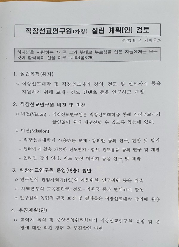 1. 직장선교 연구원(가칭) 설립 건